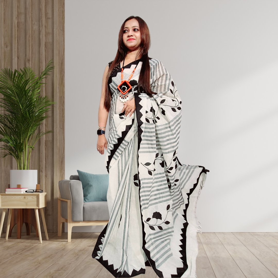Dhaniakhali Pure Cotton Applique Work Without Blouse piece. Saree length 5.5 mts.